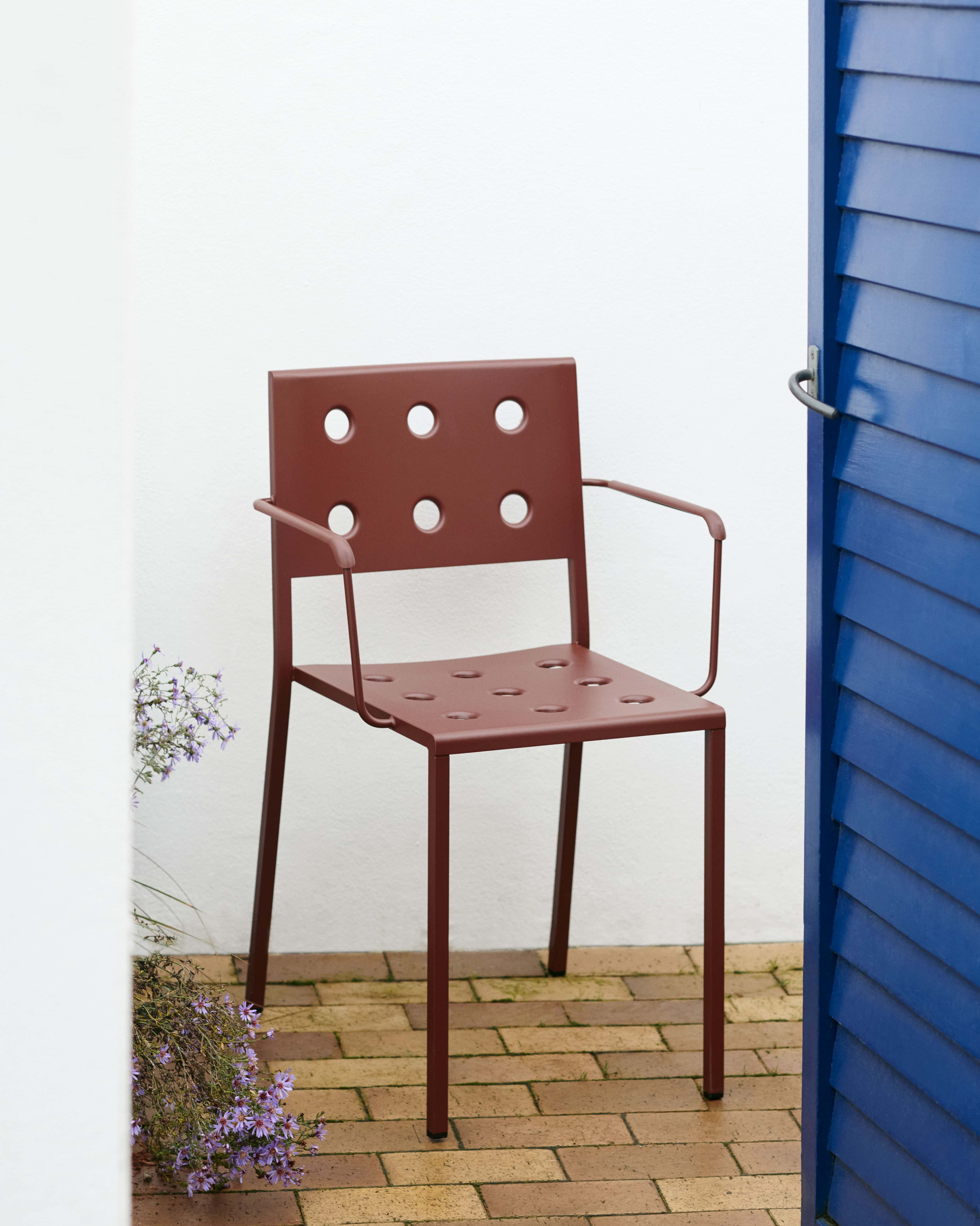 Balcony is an outdoor furniture collection of chairs, tables, and lounge chairs designed for HAY by Ronan and Erwan Bouroullec. The square design is softened by the rounded holes, which not only give the collection a distinct expression but also strengthen the shell. Made in powder-coated steel with an outdoor primer for optimal resilience and durability, the Balcony outdoor chair is well suited to balconies, gardens, and other outside spaces. It features a stackable design for easy storage.
