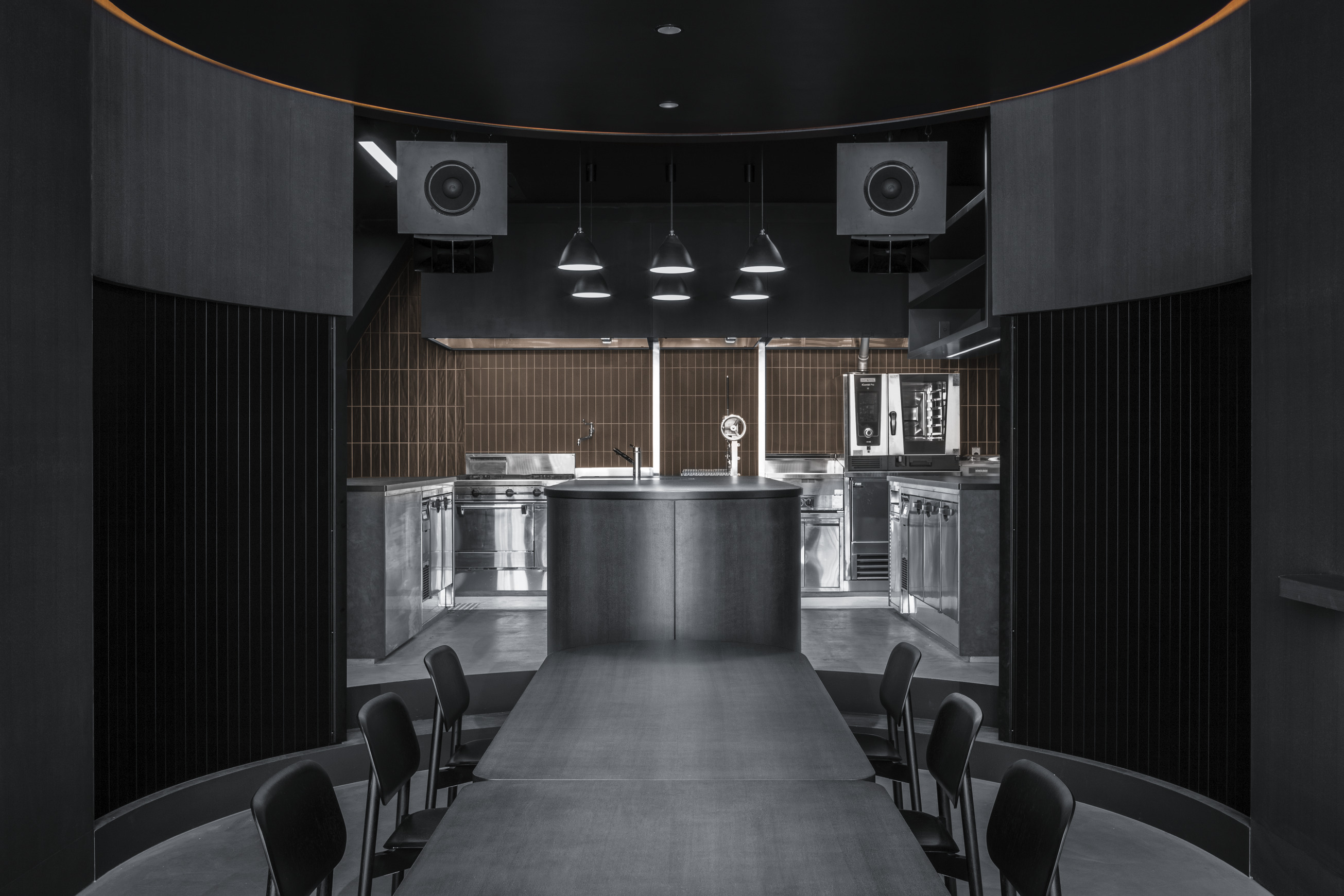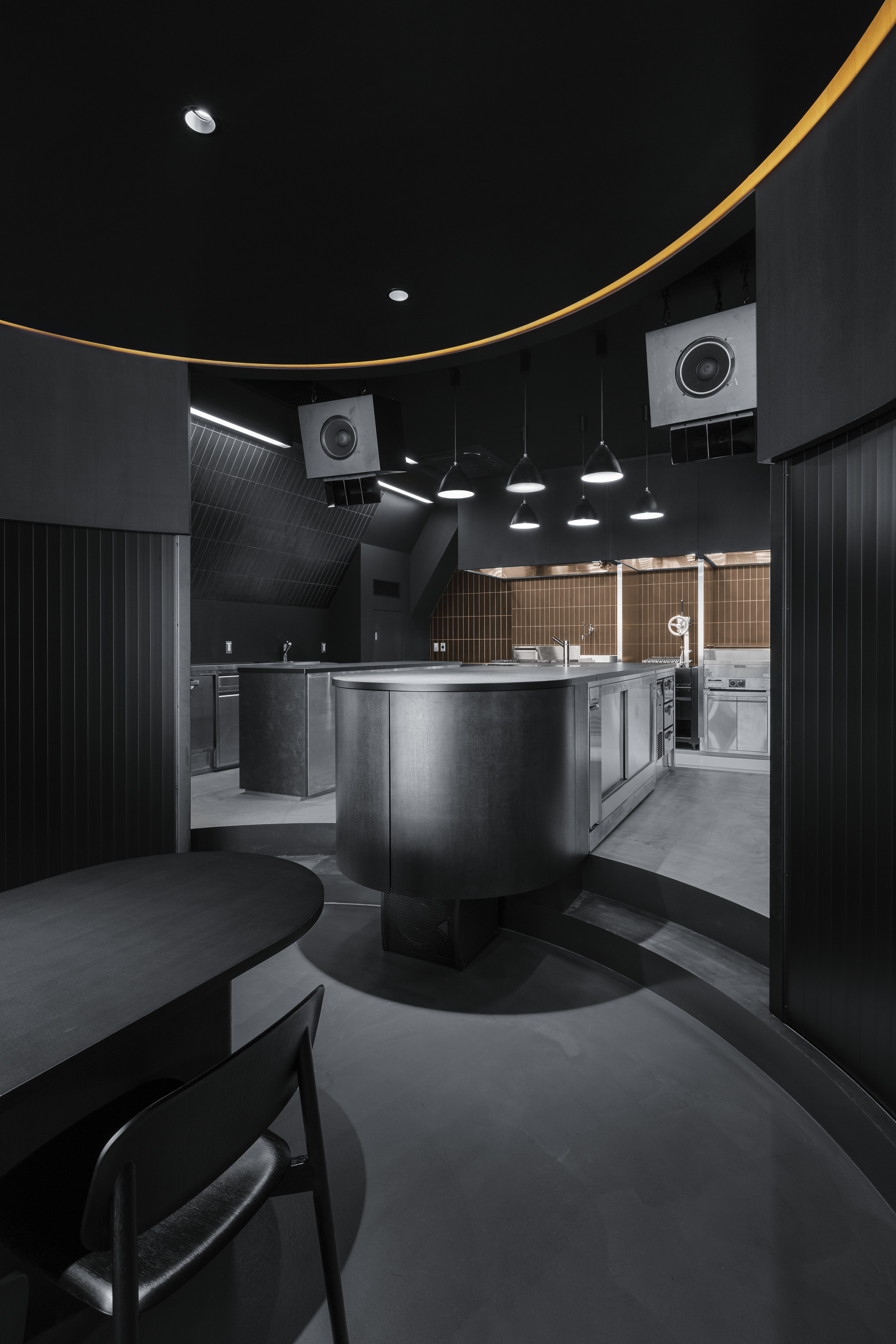 利用類似舞台的廚房作為視覺動感空間的焦點。
