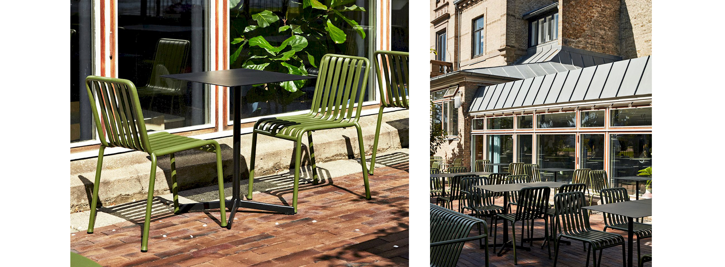 設有 Palissade 餐桌椅、圓錐形桌子和扶手椅,