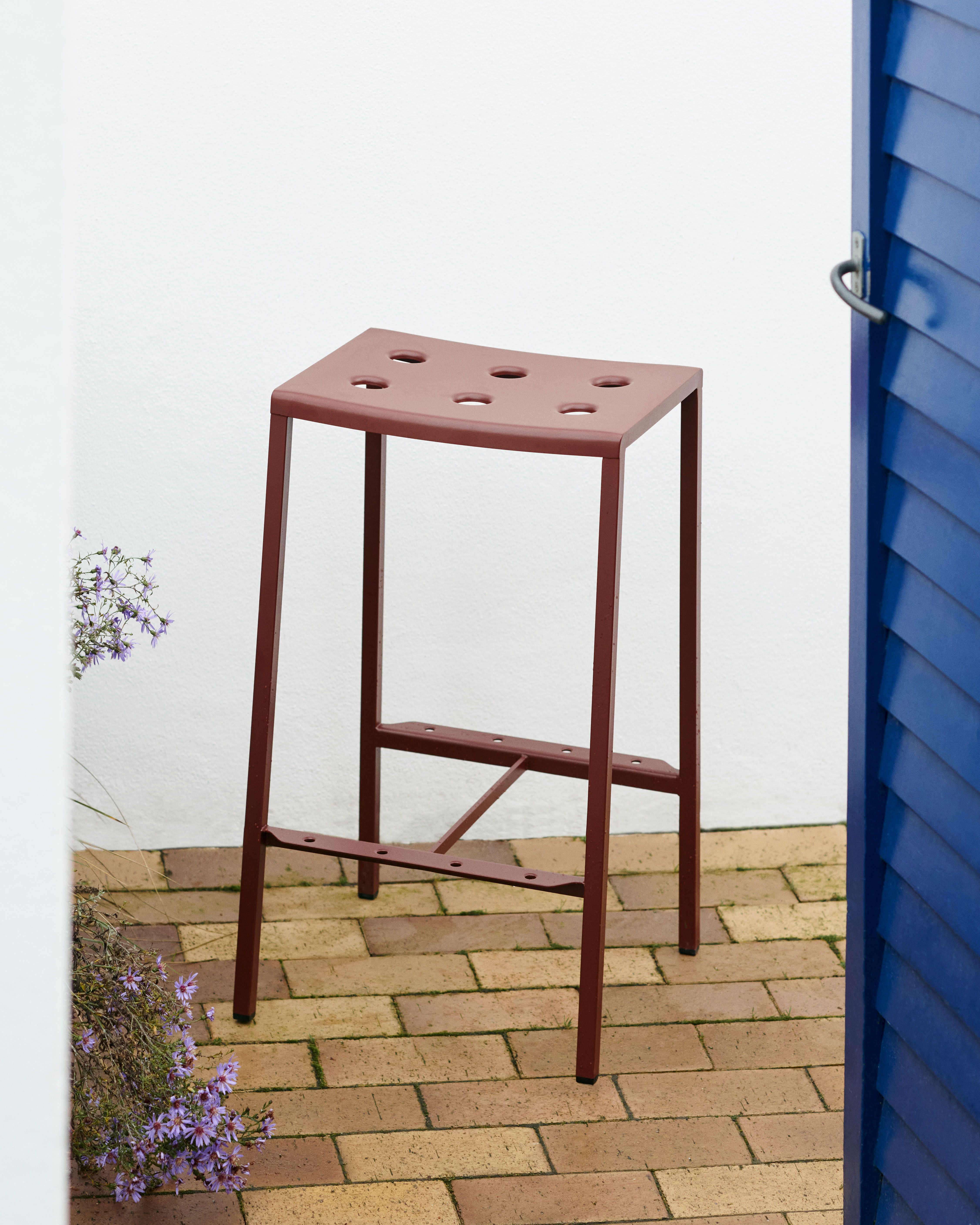Balcony 是由 Ronan 和 Erwan Bouroullec 為 HAY 設計的凳子、桌子和椅子的戶外家具系列。 圓孔軟化了方形設計,不僅賦予該系列獨特的表達方式,還強化了結構。 Balcony Bar Stool 由粉末塗層鋼製成,帶有戶外底漆,具有最佳的耐用性,非常適合陽台、花園和其他戶外空間。