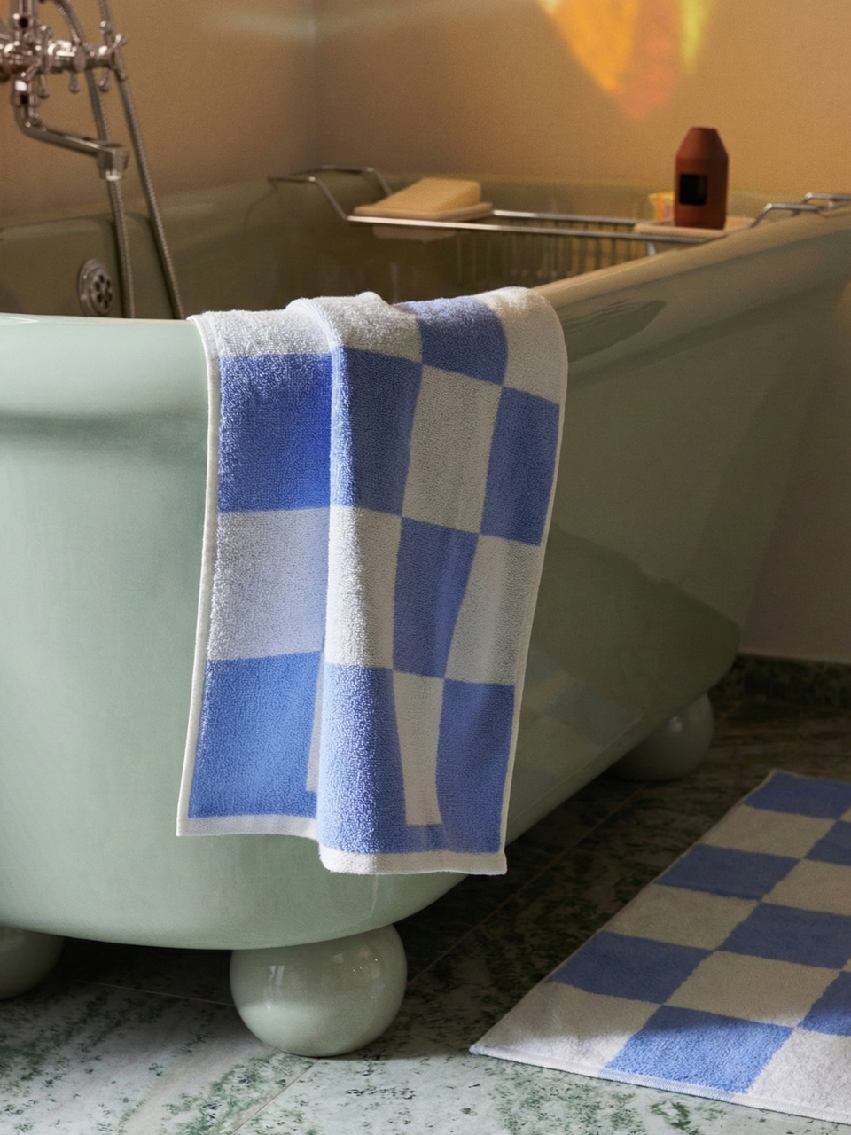 使用格紋浴室地墊,讓您的浴室煥然一新,該地墊採用耐用、吸水性強的棉質製成,質地柔軟。