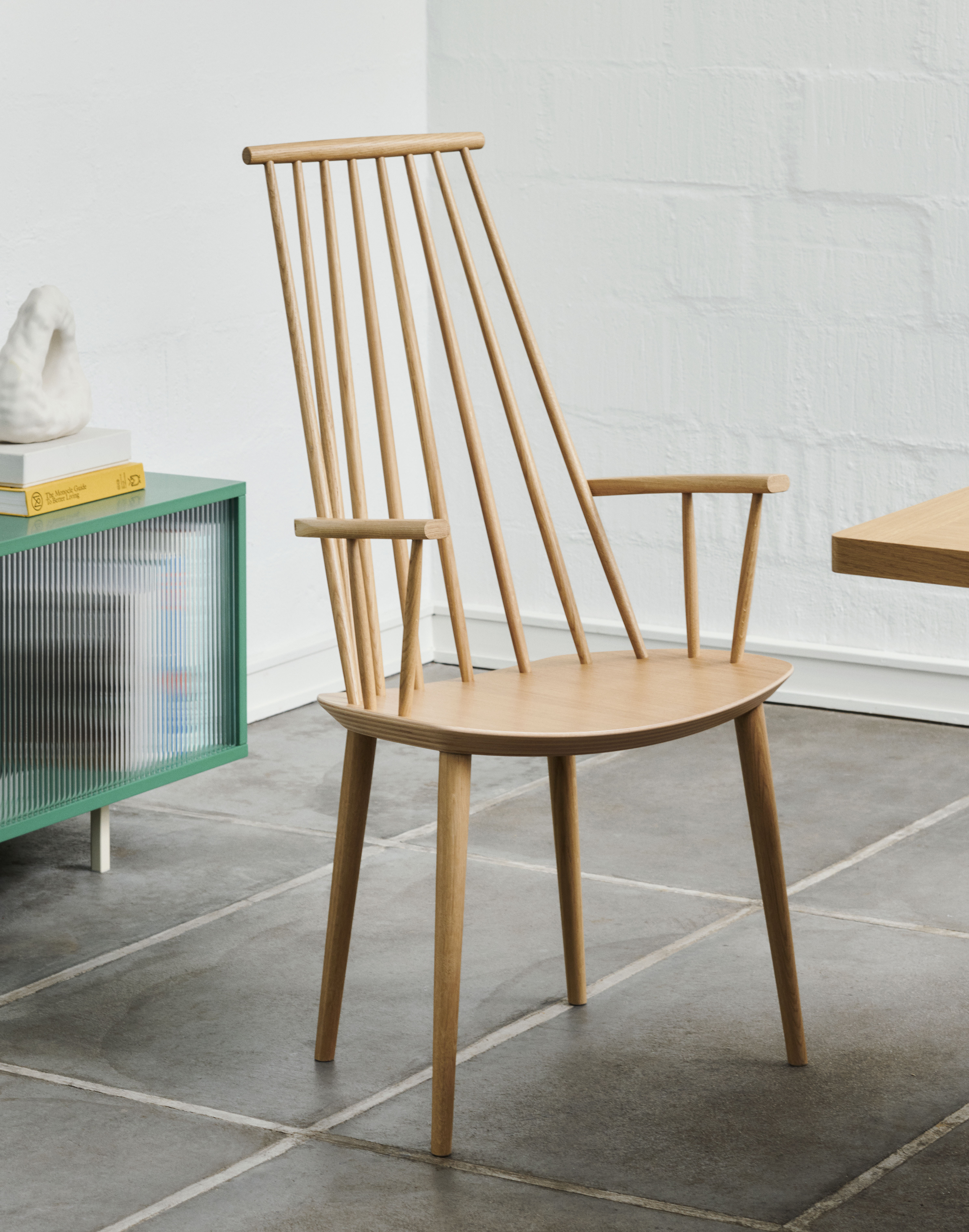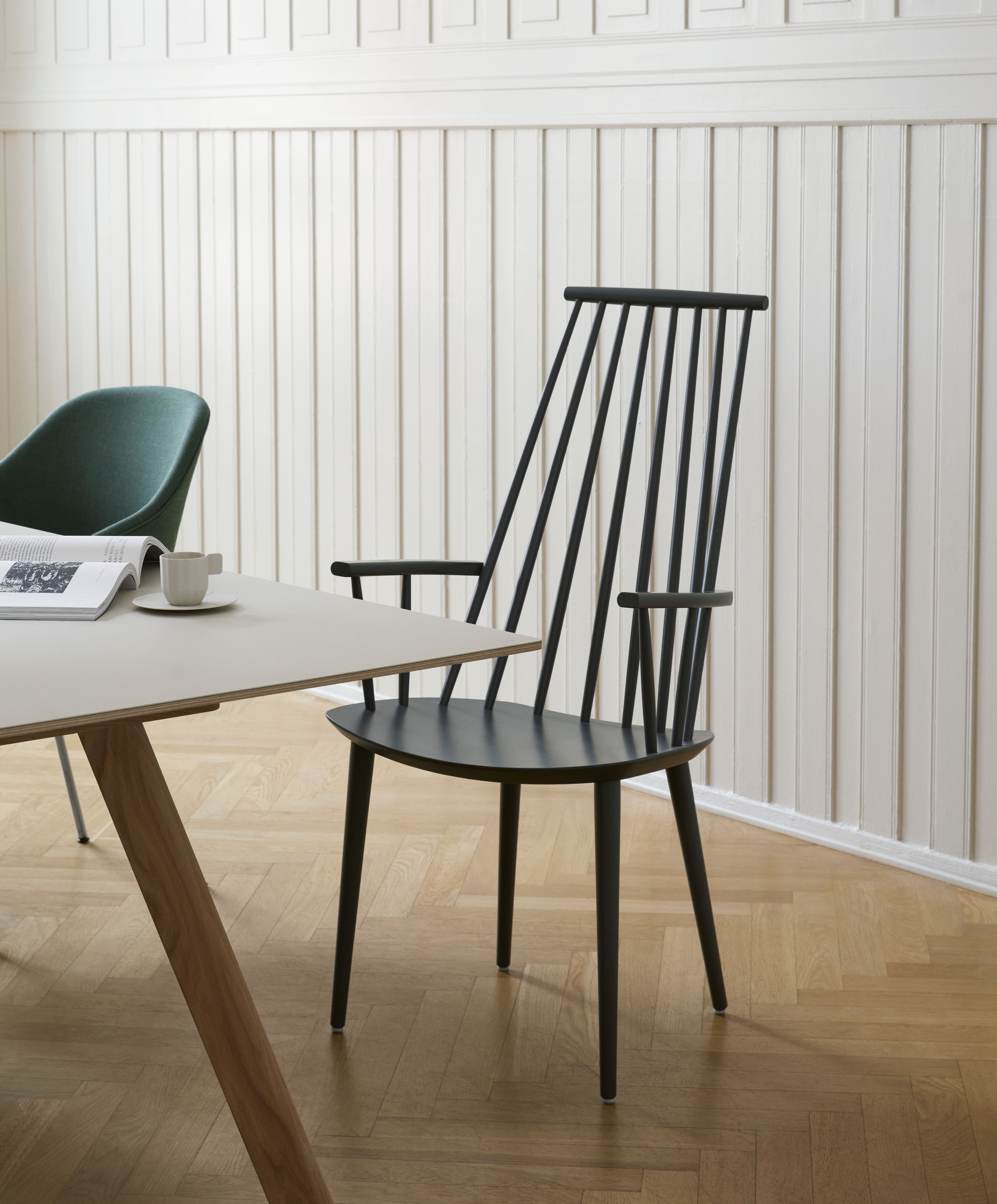 HAY 取得授權並復刻了 Poul M. Volther 經典 J110 。 此椅具有略微傾斜和輕微彎曲的主軸靠背。 高靠背、圓形扶手和凹形座椅,設計既經典又舒適。