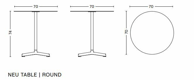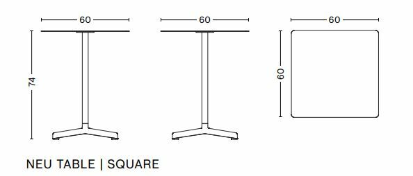 Neu 桌子的小圓形或方形桌面,連接到管狀中心柱和有角度的底座。
