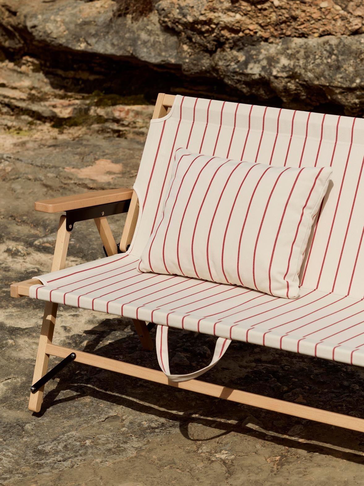 這款雙人折疊椅契合了現代人渴望親近自然的都會生活型態。它採用堅固溫潤的天然櫸木打造框架,並覆以充滿夏日活力的條紋再生聚酯纖維布料。具備雙人座的寬敞空間,卻依然保持著出色的輕量化設計,能毫不費力地在不同空間移動。