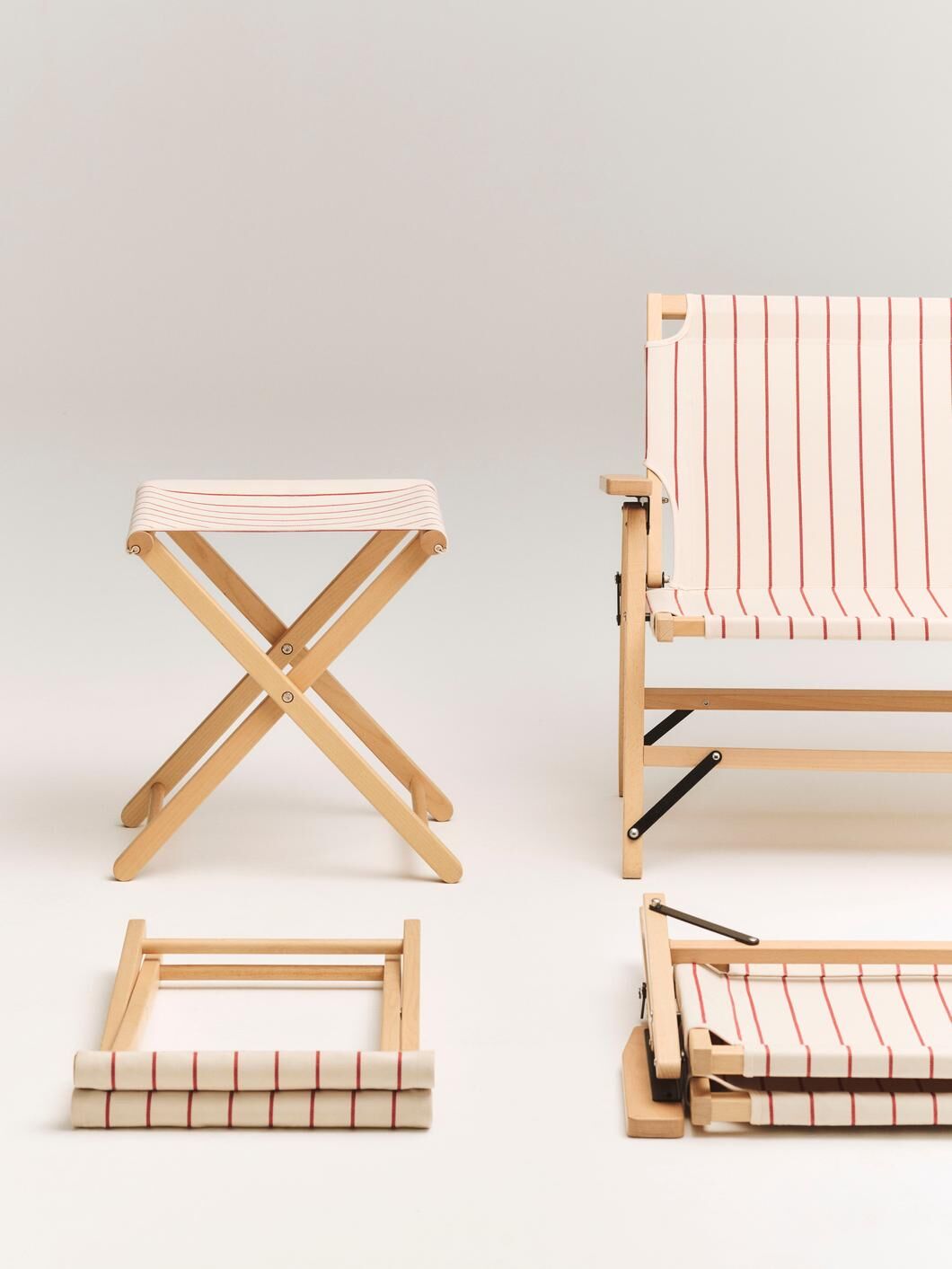 結合溫潤櫸木與條紋椅面,總重僅 1.2 公斤並附專屬收納提袋。無論是野餐時的臨時置物小桌,或是作為放鬆雙腿的腳凳,都能完美勝任。