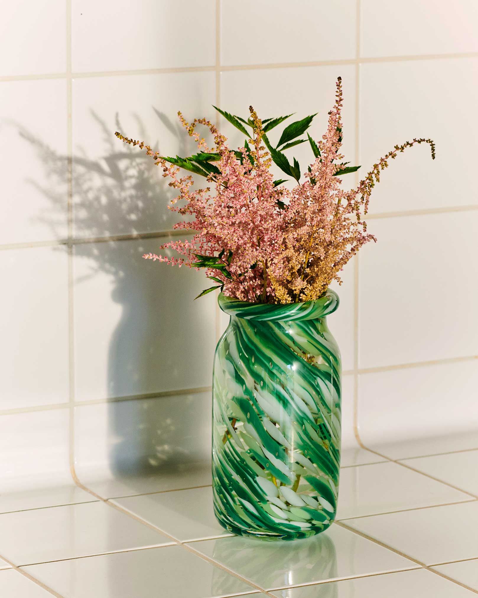 Splash 花瓶採用特殊的玻璃吹製技術手工製作,多層彩色玻璃點,具有獨特的漩渦圖案。